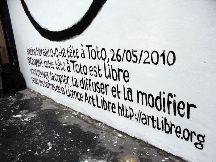Photographie : Antoine Moreau, "La mention copyleft de la tête à Toto du mur Saint Martin", 26 mai 2010.