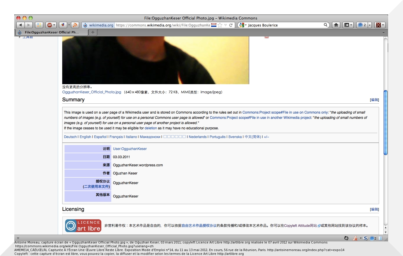 Antoine Moreau, capture écran de « OgguzhanKeser Official Photo.jpg », de Oğuzhan Keser, 03 mars 2011, copyleft Licence Art Libre http://artlibre.org réalisée le 07 avril 2012 sur Wikimedia Commons https://commons.wikimedia.org/wiki/File:OgguzhanKeser_Official_Photo.jpg?uselang=zh