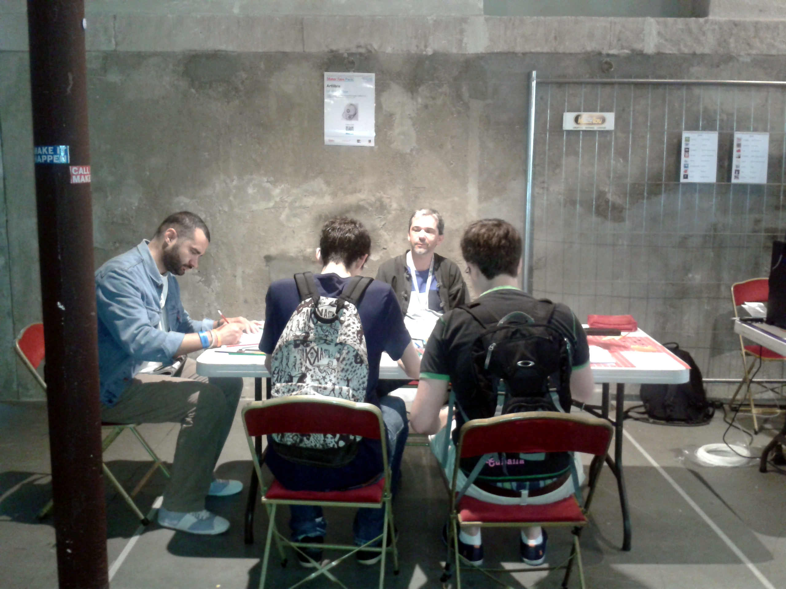 MakeFaire Paris Dessins Copyleft (Antoine regarde) Je regarde les dessins en train de se faire lors de la MakerFaire Paris.