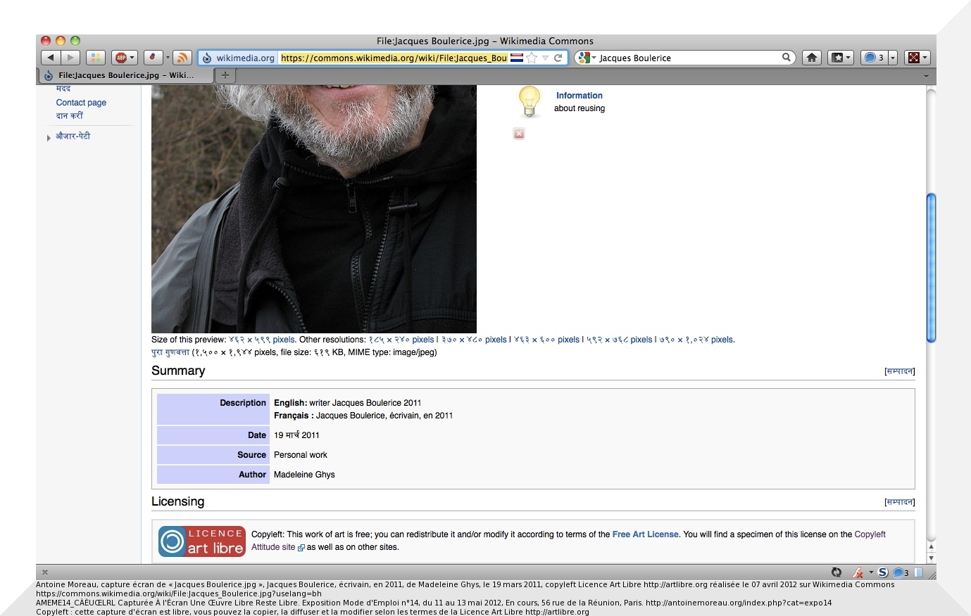 Antoine Moreau, capture écran de « Jacques Boulerice.jpg », Jacques Boulerice, écrivain, en 2011, de Madeleine Ghys, le 19 mars 2011, copyleft Licence Art Libre http://artlibre.org réalisée le 07 avril 2012 sur Wikimedia Commons https://commons.wikimedia.org/wiki/File:Jacques_Boulerice.jpg?uselang=bh