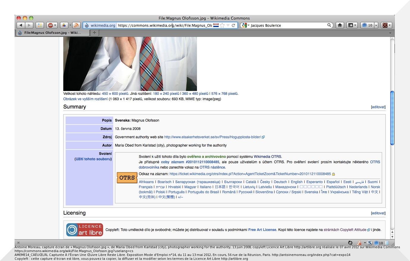 Antoine Moreau, capture écran de « Magnus Olofsson.jpg », de Maria Obed from Karlstad (city), photographer working for the authority, 13 juin 2008, copyleft Licence Art Libre http://artlibre.org réalisée le 07 avril 2012 sur Wikimedia Commons https://commons.wikimedia.org/wiki/File:Magnus_Olofsson.jpg?uselang=cs