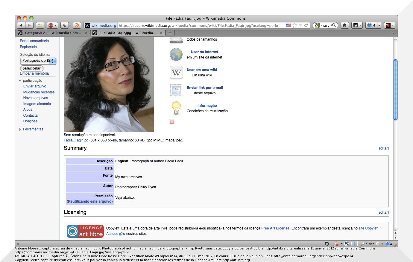 Antoine Moreau, capture écran de « Fadia Faqir.jpg », Photograph of author Fadia Faqir, de Photographer Philip Ryott, sans date, copyleft Licence Art Libre http://artlibre.org réalisée le 11 janvier 2012 sur Wikimedia Commons https://commons.wikimedia.org/wiki/File:Fadia_Faqir.jpg?uselang=pt-br