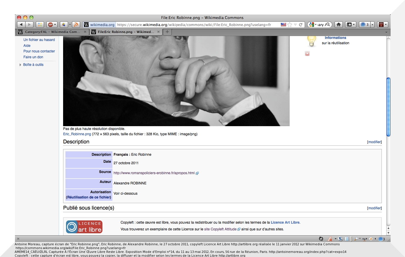 Antoine Moreau, capture écran de « Eric Robinne.png », Eric Robinne, de Alexandre Robinne, le 27 octobre 2011, copyleft Licence Art Libre http://artlibre.org réalisée le 11 janvier 2012 sur Wikimedia Commons https://commons.wikimedia.org/wiki/File:Eric_Robinne.png?uselang=fr