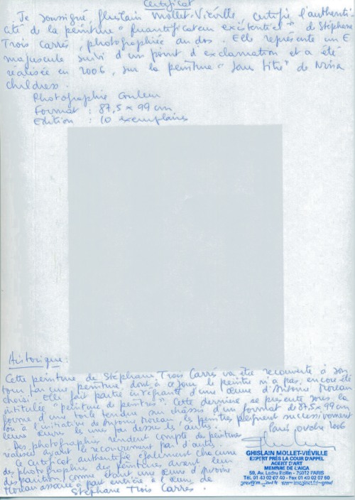 certificat d'authenticité Stéphane Trois Carrés