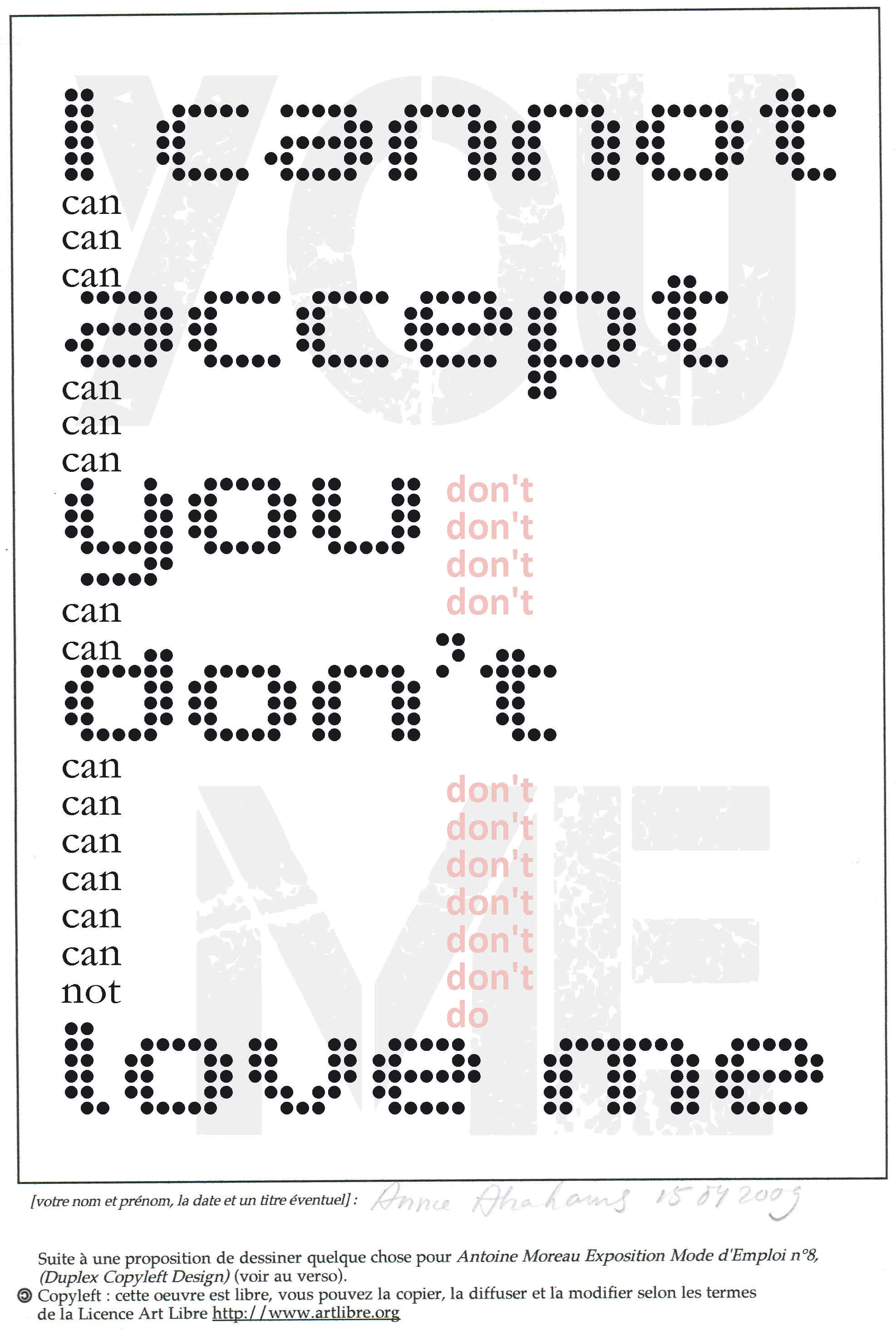 Réalisé lors de AMEME8 (Antoine Moreau Exposition Mode d'Emploi n°8).